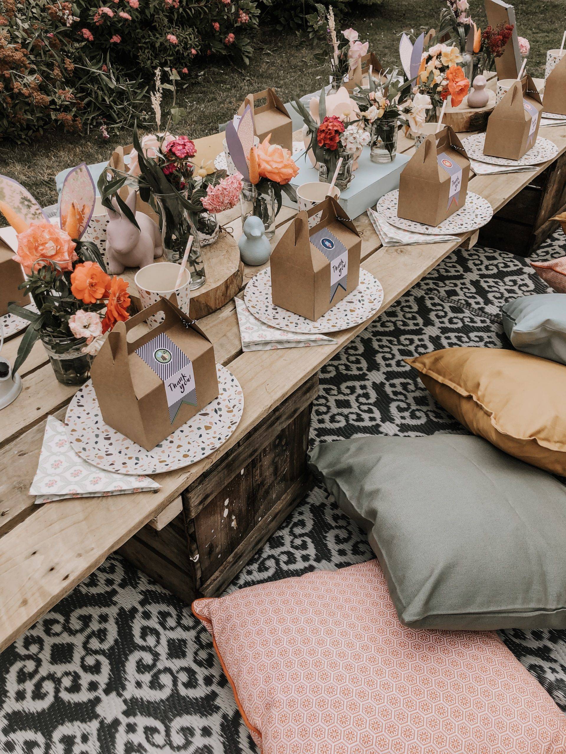 Pesta piknik adalah ide yang sempurna untuk ulang tahun. Anda dapat mengatur beberapa meja rendah menggunakan peti kayu dan palet. Bawa bantal empuk Anda untuk kenyamanan dan gunakan piring dan cangkir bambu.