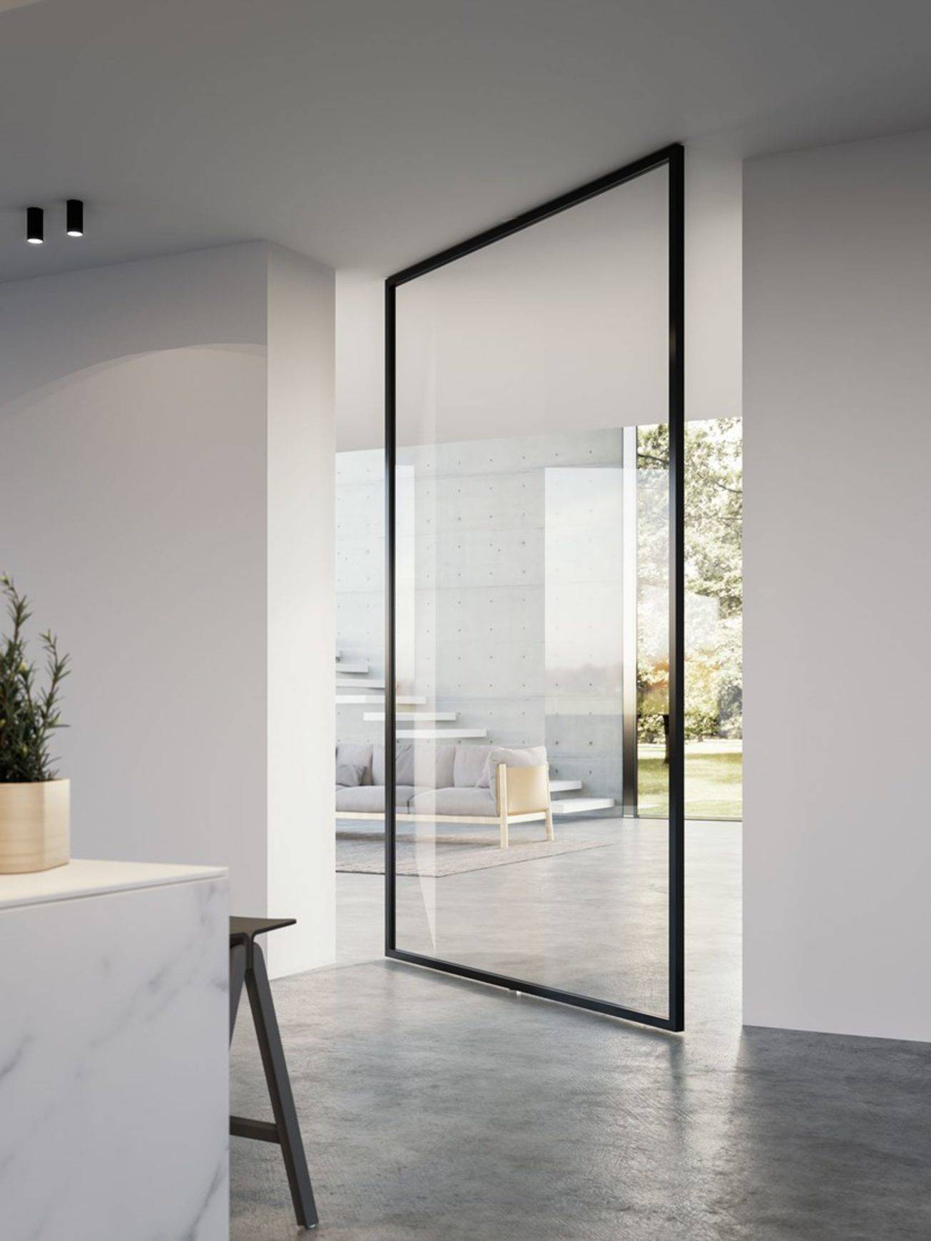 Gerakan ramping dari pintu pivot sangat ideal untuk mempercantik lorong. Pintu minimalis dengan bingkai hitam ini mendukung gaya modern sekaligus berfungsi sebagai transisi elegan ke dapur. Dengan pintu ini, mereka berhasil membuat pemisahan antara ruang sekaligus membuat mereka merasa benar-benar terbuka dan terhubung.