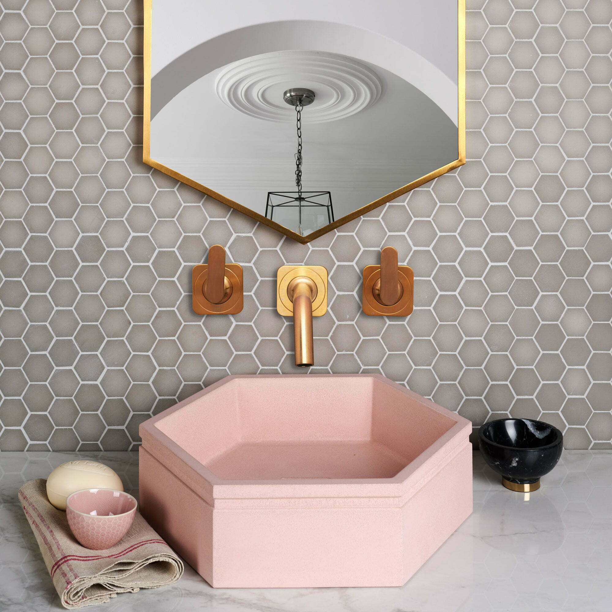 Ubin heksagonal sangat populer untuk kamar mandi modern, tetapi jika Anda menggunakannya sebagai ide ubin ruang ganti, pilih ukuran yang lebih kecil sehingga proporsinya sesuai dengan ukuran ruangan. Desain ini terbuat dari kaca daur ulang yang memancarkan daya tarik lingkungan. Ruangan telah lebih ditingkatkan dengan baskom heksagonal ukuran kecil juga, dan menambahkan sentuhan mewah dengan counter top efek marmer. Ubin ini juga bisa digunakan di lantai.
