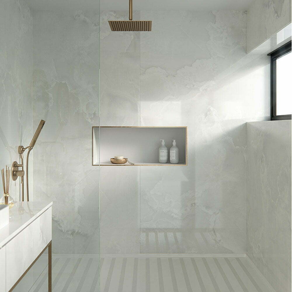 Ciptakan kesan dalam skema pancuran putih sederhana dengan melapisi ceruk rak keramik dengan tepi berwarna emas. Trim aksen kontras akan menarik perhatian ke area tersebut dan menambahkan sentuhan gaya dalam sentuhan akhir metalik yang melengkapi perlengkapan shower dan kamar mandi.