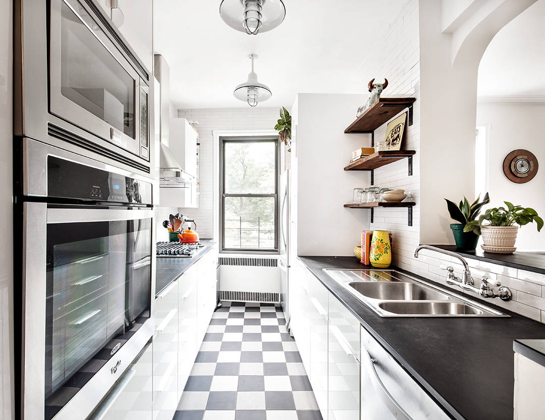 Bagaimanapun, ini adalah dapur dapur kecil. Namun, dapur menggunakan setiap ons ruang yang tersedia untuk memaksimalkan tata ruang yang sempit. itu rak terbuka dan lantai kotak-kotak di jalan sempit memungkinkan dapur dapur kecil untuk menciptakan kesan yang luar biasa. Rak terbuka menciptakan tampilan terbuka di ruang kecil sekalipun.