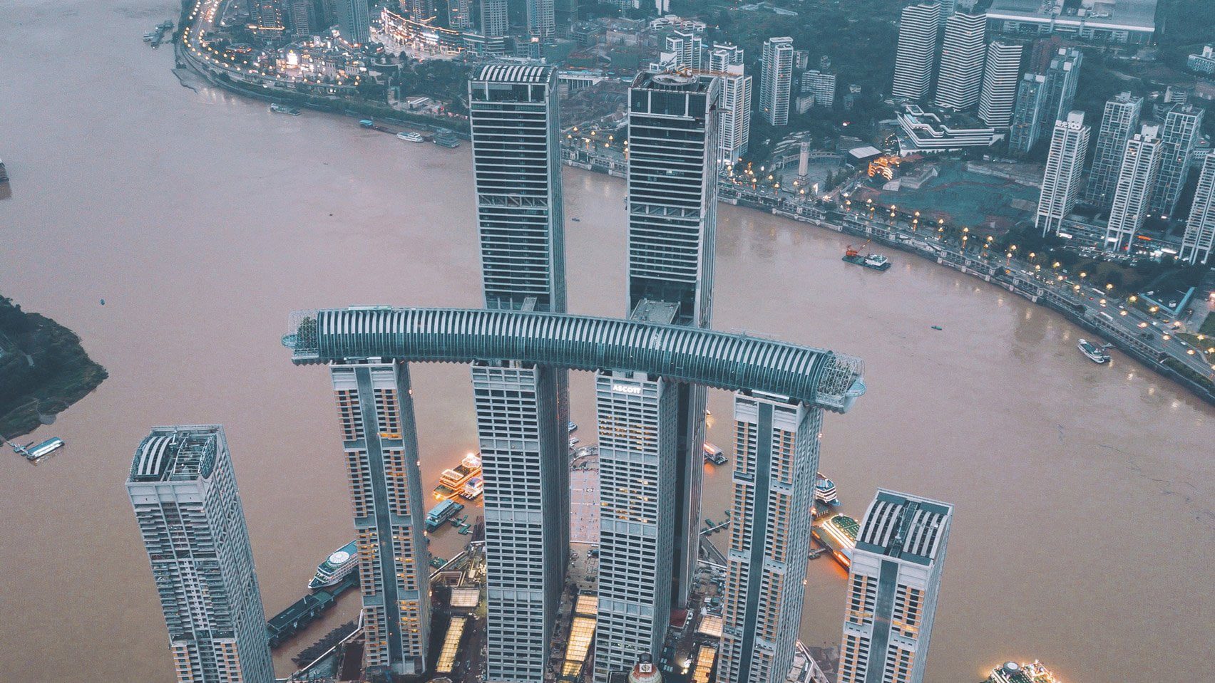 Di kompleks Raffles City di Chongqing, skybridge Crystal menghubungkan empat gedung pencakar langit setinggi 250 meter.