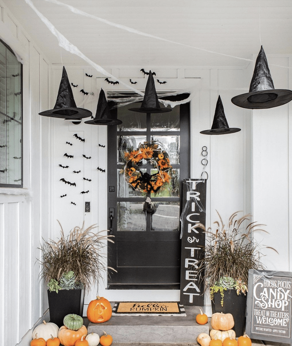 Rumah ini mempertahankan warna tradisional Halloween dengan semburan oranye, hitam, dan kuning. Dekorasinya halus dan tidak berlebihan, memungkinkan rumah untuk tetap terlihat berkelas dan modern. Untuk sentuhan yang menyenangkan, topi penyihir hitam digantung di tali pancing dari langit-langit teras.