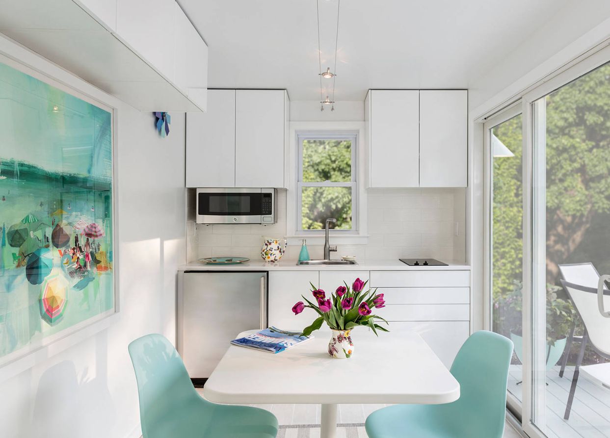 Dapur kecil biasa ditemukan di studio atau apartemen efisiensi. Studio Jenny Andre Designing menunjukkan di sini cara yang bagus untuk menonjolkan dapur kecil dan menonjol dari fungsi lainnya dalam denah lantai terbuka kecil. Itu terjadi melalui warna yang benar-benar menjadikan ruang kecil ini sebagai titik fokus. Langit-langit tinggi adalah nilai tambah yang bagus dalam kasus khusus ini karena menawarkan beberapa ruang penyimpanan tambahan di atas lemari.