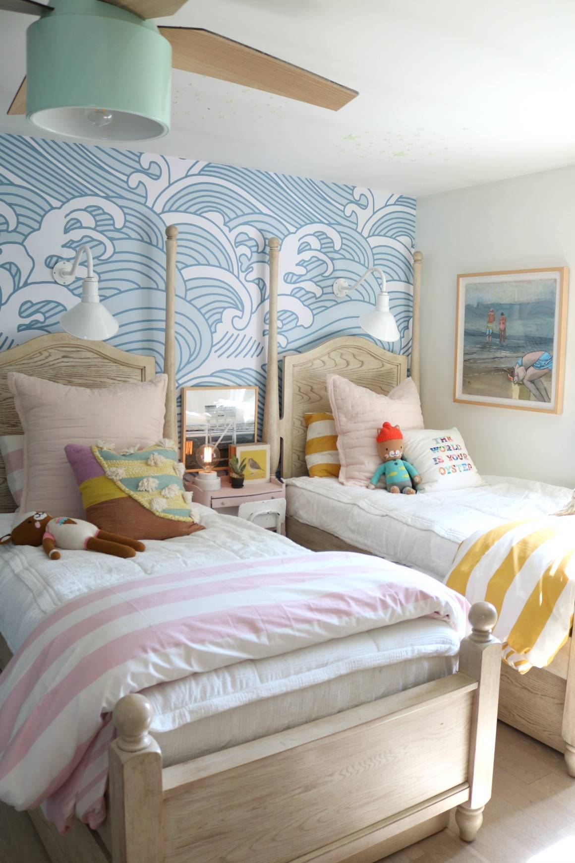 Menambahkan nama anak-anak adalah cara yang menyenangkan dan mudah untuk mengatur ruang pribadi mereka. Untuk ini, Anda dapat menambahkan bantal khusus yang disulam dengan nama mereka. Atau, coba beberapa cetakan dinding yang lucu. Anda juga dapat menyesuaikan setiap tempat tidur dengan mainan favorit mereka.