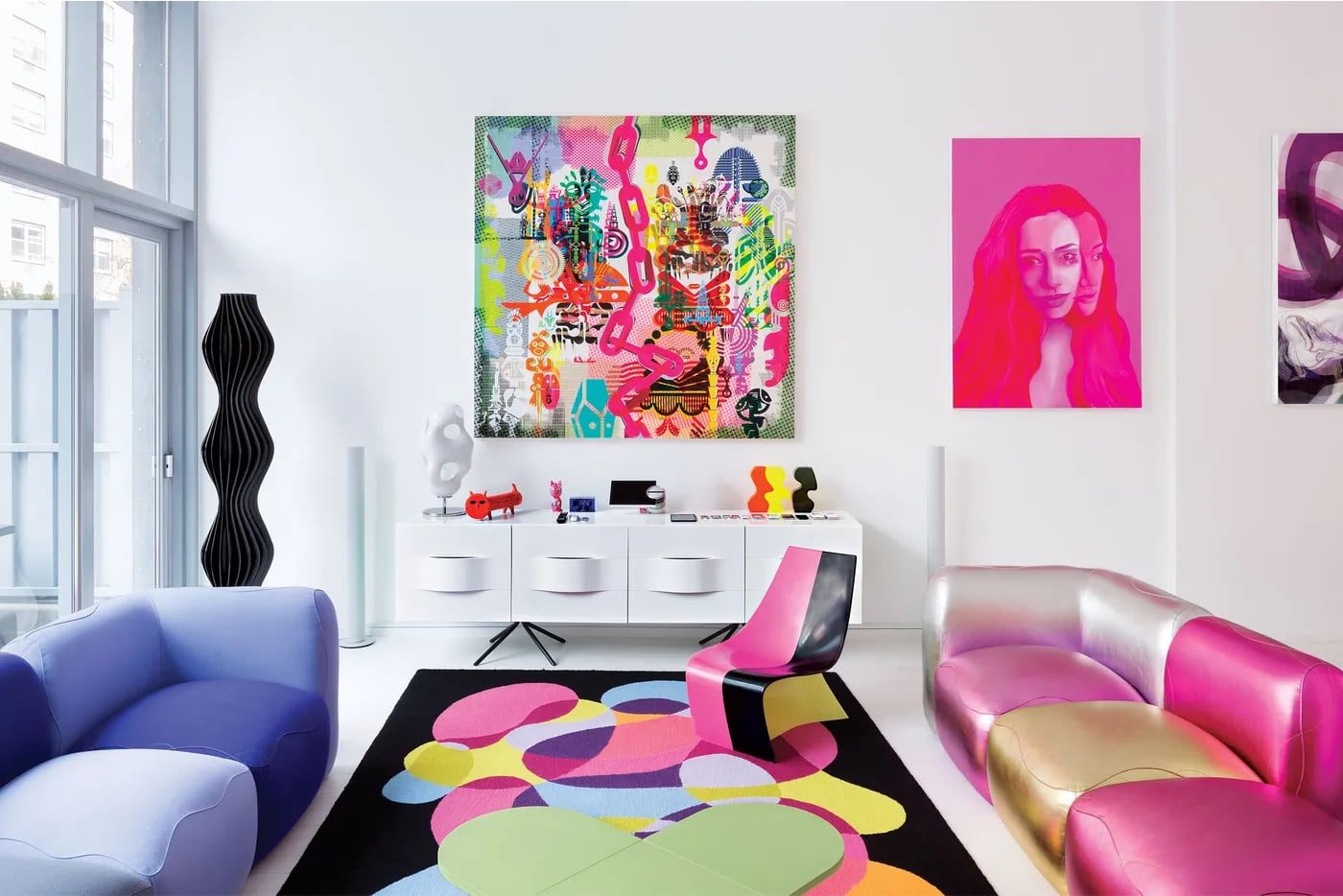 Bangun interior loteng yang berfokus pada warna dengan karya seni yang unik dan tepi yang mengkilap.