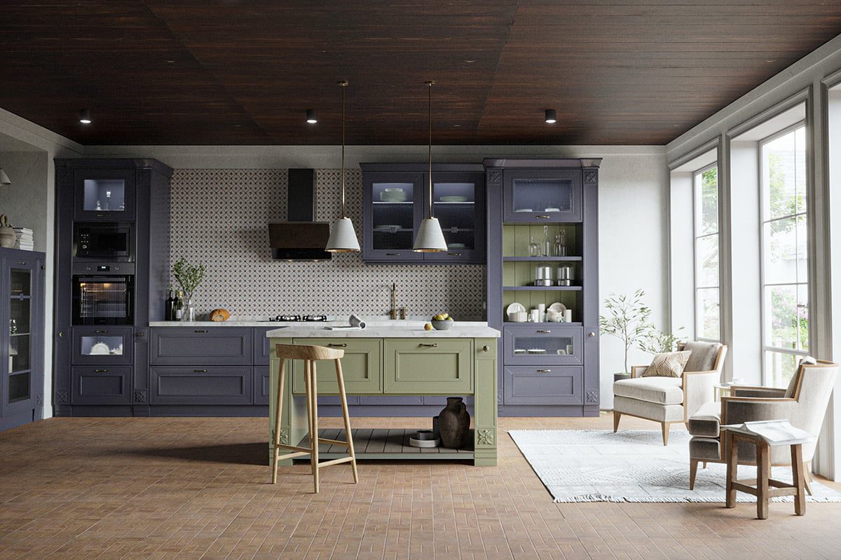 Cat pulau dapur dengan warna yang kontras. Instalasi dapur pedesaan biru ini dipadukan dengan perawatan pulau hijau bijak, yang memberikan skema dekorasi tampilan berlapis.