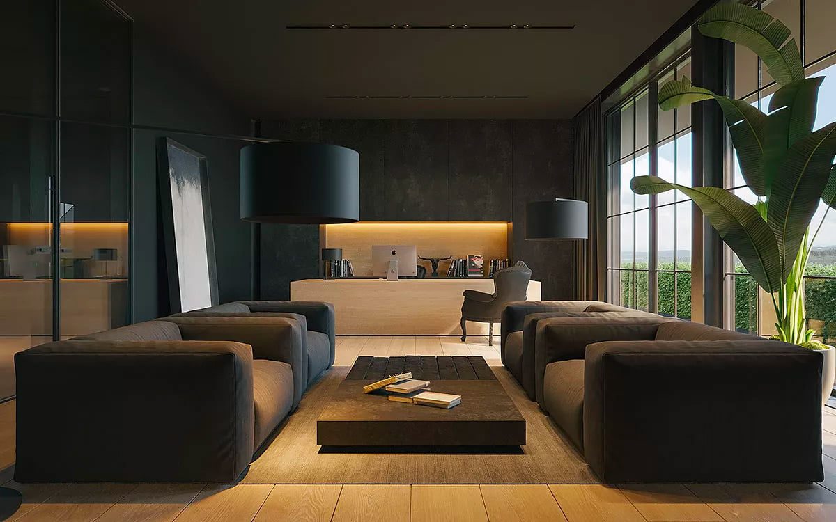 Skema ruang tamu yang gelap memungkinkan keindahan alam sekitar menjadi bintang pertunjukan. Pertimbangkan memasang jendela tepi-ke-tepi untuk membuka pemandangan taman, atau mengolah halaman.