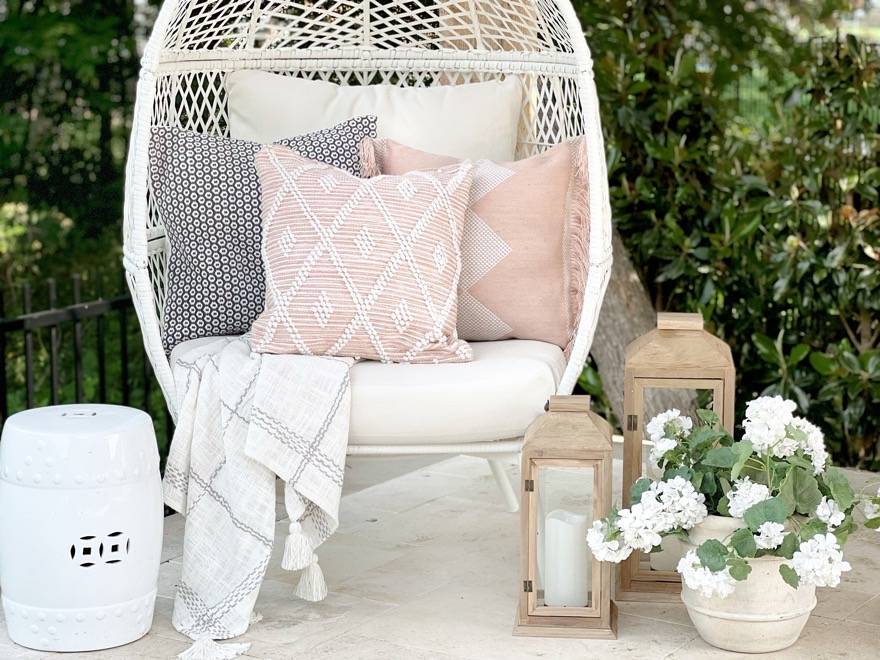 Ayunan teras menjadi sudut baca yang nyaman saat diberi aksesori. Satu set bantal bertekstur dan selimut membuat tempat yang nyaman untuk bersantai dan membaca. Sebuah meja samping kecil tersedia untuk menyimpan buku Anda dan minuman yang menyegarkan, sementara lentera dan pot tanaman menopang latarnya.