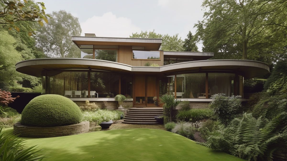Atap kupu-kupu membangun bakat modern abad pertengahan yang tidak salah lagi di atas teras yang cerah ini.