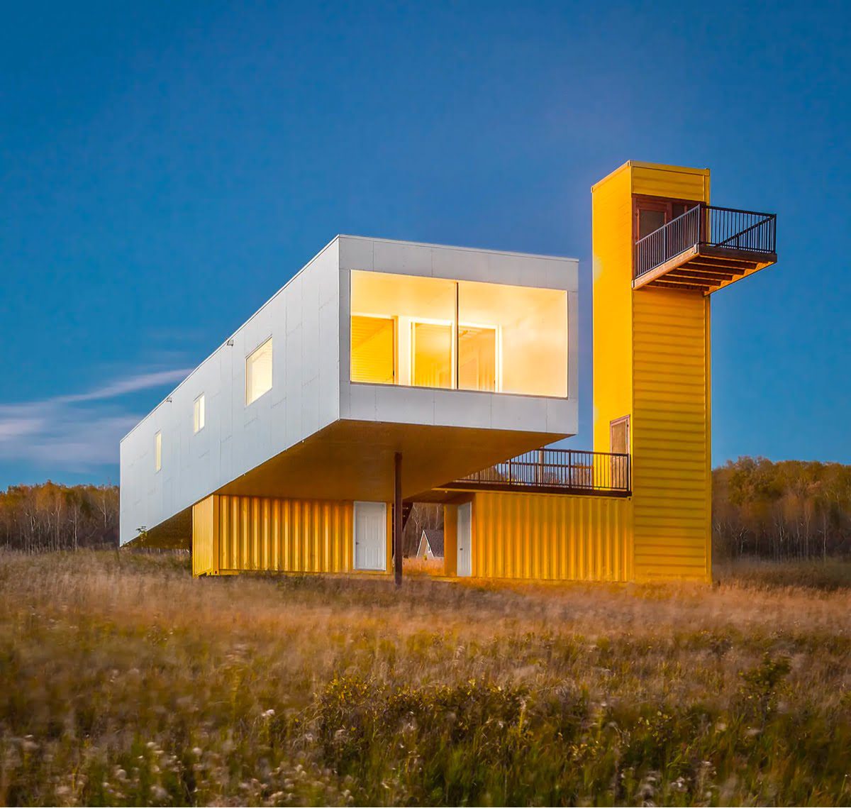 Terletak di Lake of the Prairies di Manitoba, Kanada, rumah kontainer 3 bagian ini memiliki volume kantilever yang dipasang di atas volume penyangga tegak lurus. Wadah ketiga berdiri di ujungnya membentuk menara pengintai di atas danau.