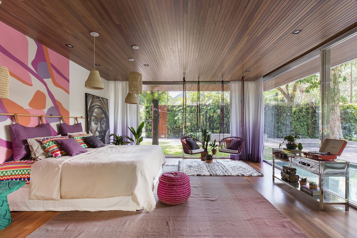 Ciptakan kamar tidur berwarna-warni dengan dinding fitur headboard yang berani, berbagai macam bantal yang tersebar, keranjang cerah, dan tirai berwarna. Skema dekorasi kamar tidur berwarna cerah ini diperhalus dengan pengenalan perawatan langit-langit kayu yang bersahaja.