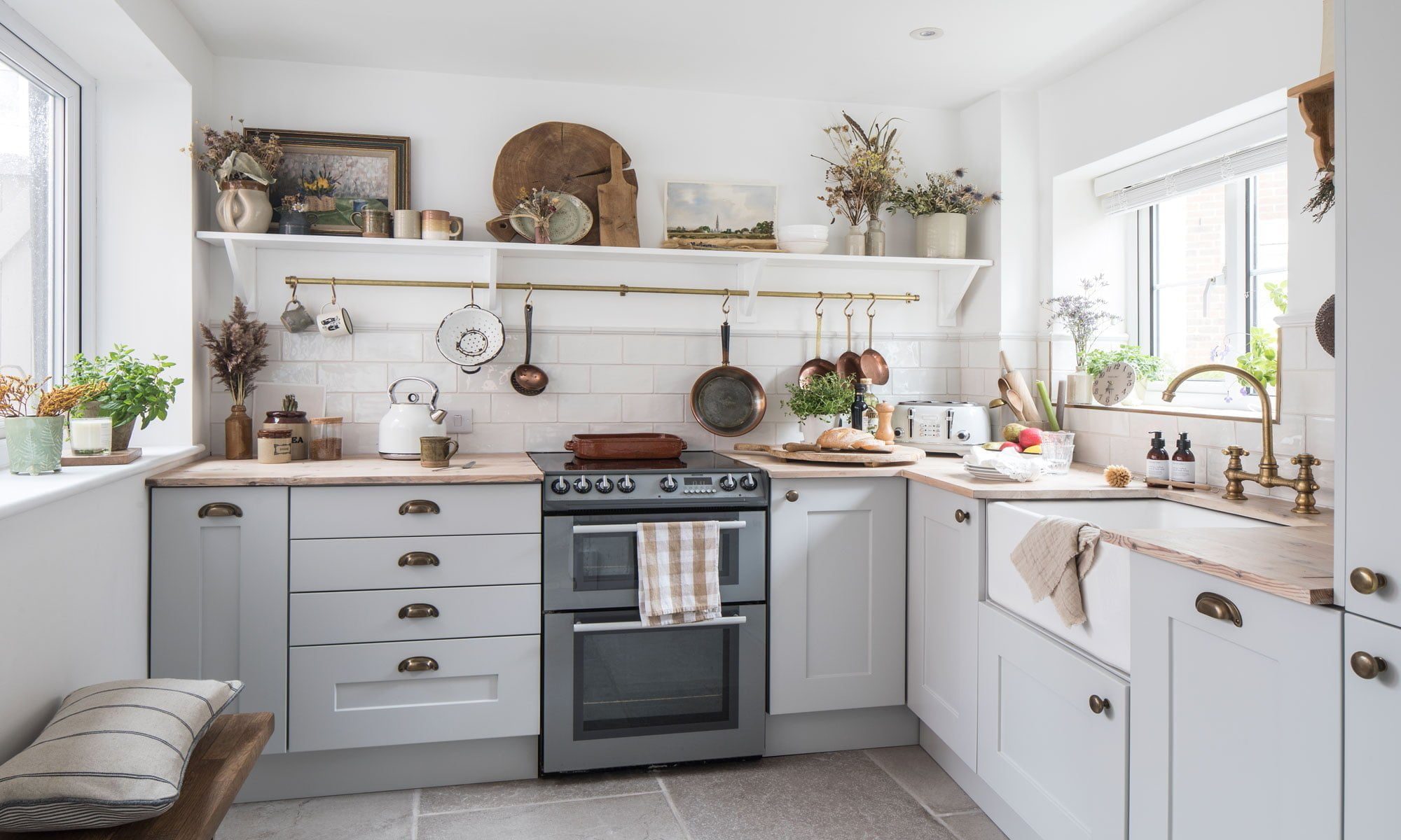 Pemiliknya memilih lemari bergaya pengocok yang dipesan lebih dahulu dari Dapur DIY tetapi dapat menghemat uang untuk perlengkapan dan perlengkapannya. Mereka memasang pemanas di bawah lantai, ubin lantai, memasang semua lemari dan belajar cara memasang splashback dapur sendiri. Mereka juga menghemat banyak uang dengan mengapur dan meminyaki papan lantai tua sebagai bagian atas pekerjaan.