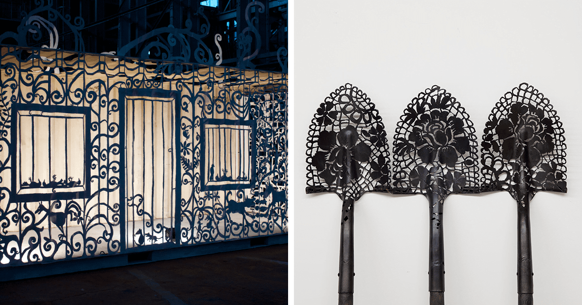 Berkat Cal Lane, baja sering dikaitkan dengan kejantanan yang kokoh dan mendapatkan bentuk yang sama sekali berbeda. Seniman melembutkan citranya dengan mengukir pola seperti renda yang mengubah penyajiannya menjadi sesuatu yang lebih feminin. Dengan cara ini, kita bisa menyaksikan paradoks dari dua dunia ini menyatu. Lane menggunakan berbagai bahan seperti kap mobil dan truk, sekop, gerobak dorong, dan drum minyak. Mengenai pola yang dipilih Cal untuk tali sepatunya, mereka sering merujuk pada agama dan mengisyaratkan kapasitas representatif renda untuk mengekspos dan menyembunyikan.