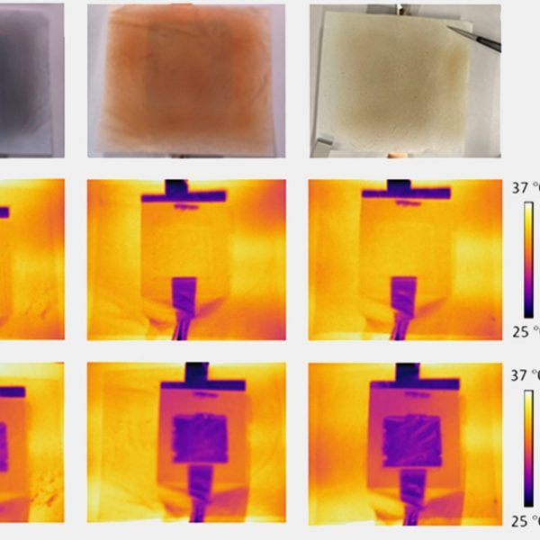 Pada saat yang sama, itu juga mengubah jumlah panas inframerah yang diserap atau dipancarkannya dari gedung. Pada hari-hari panas, bahan tersebut tampak kuning di bawah pencitraan termal, menunjukkan bahwa ia memancarkan lebih banyak panas, sementara pada hari-hari dingin tampak ungu karena menahan panas tersebut.