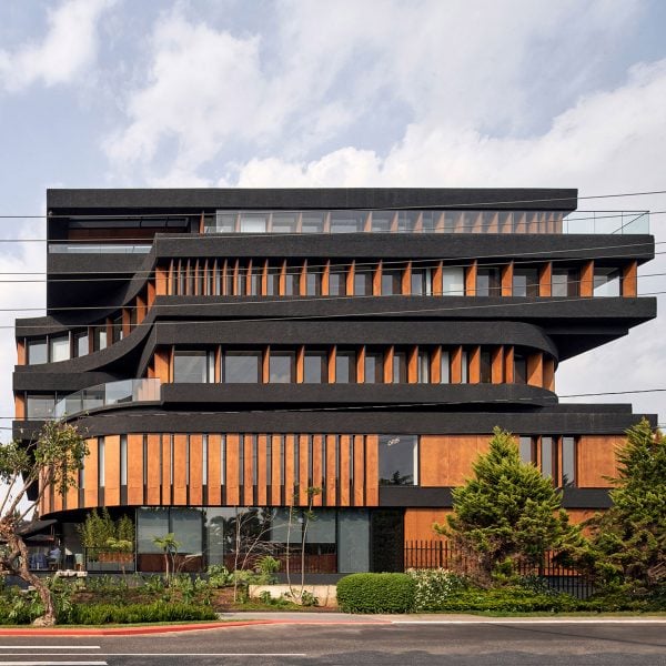 Pelat lantai – dibalut dengan warna hitam dan abu-abu tua yang tebal dan tahan lama – disandingkan dengan lapisan kaca yang bersebelahan dan sirip kayu ringan yang menambahkan tekstur alami dan melayani tujuan estetika dan fungsional.