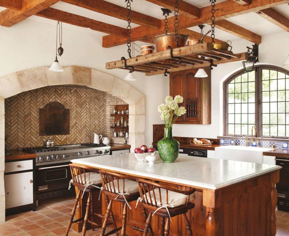 Beberapa dapur Tuscany menampilkan lebih banyak detail yang memiliki kualitas sederhana dan pedesaan. Dapur Tuscan pedesaan dari Ryan Street Architects ini membangun dapur ini di sekitar detail seperti langit-langit balok kasar yang terbuka, dinding batu, dan backsplash bercat putih.