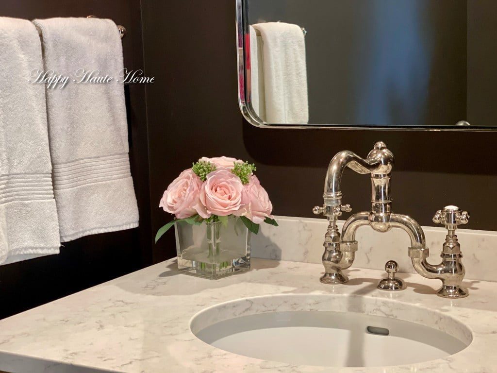 Ketika kami merombak ruang rias formal kami, gaya dekorasi saya sedikit berbeda. Dinding gelap dan murung dan meja rias kayu ek pudar dengan keran pedesaan Prancis juga menjadi indah.