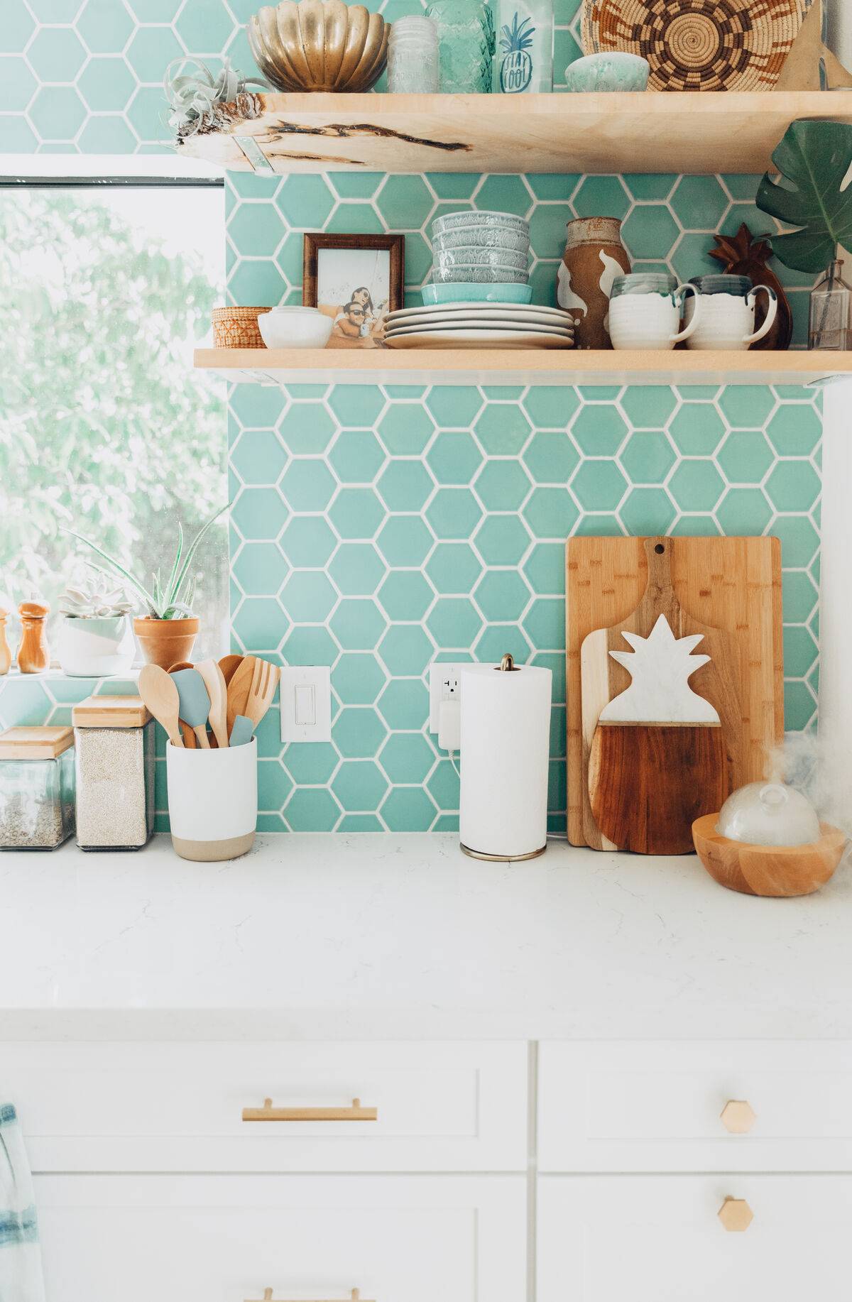 Warna yang segar dan pola yang menarik dapat mengangkat gaya dapur yang netral. Warna mint yang semarak dan pola geometris ini menambah daya tarik visual pada dapur berwarna terang. Pilih ubin kupas dan tempel untuk pembaruan dapur yang mudah tanpa biaya banyak.