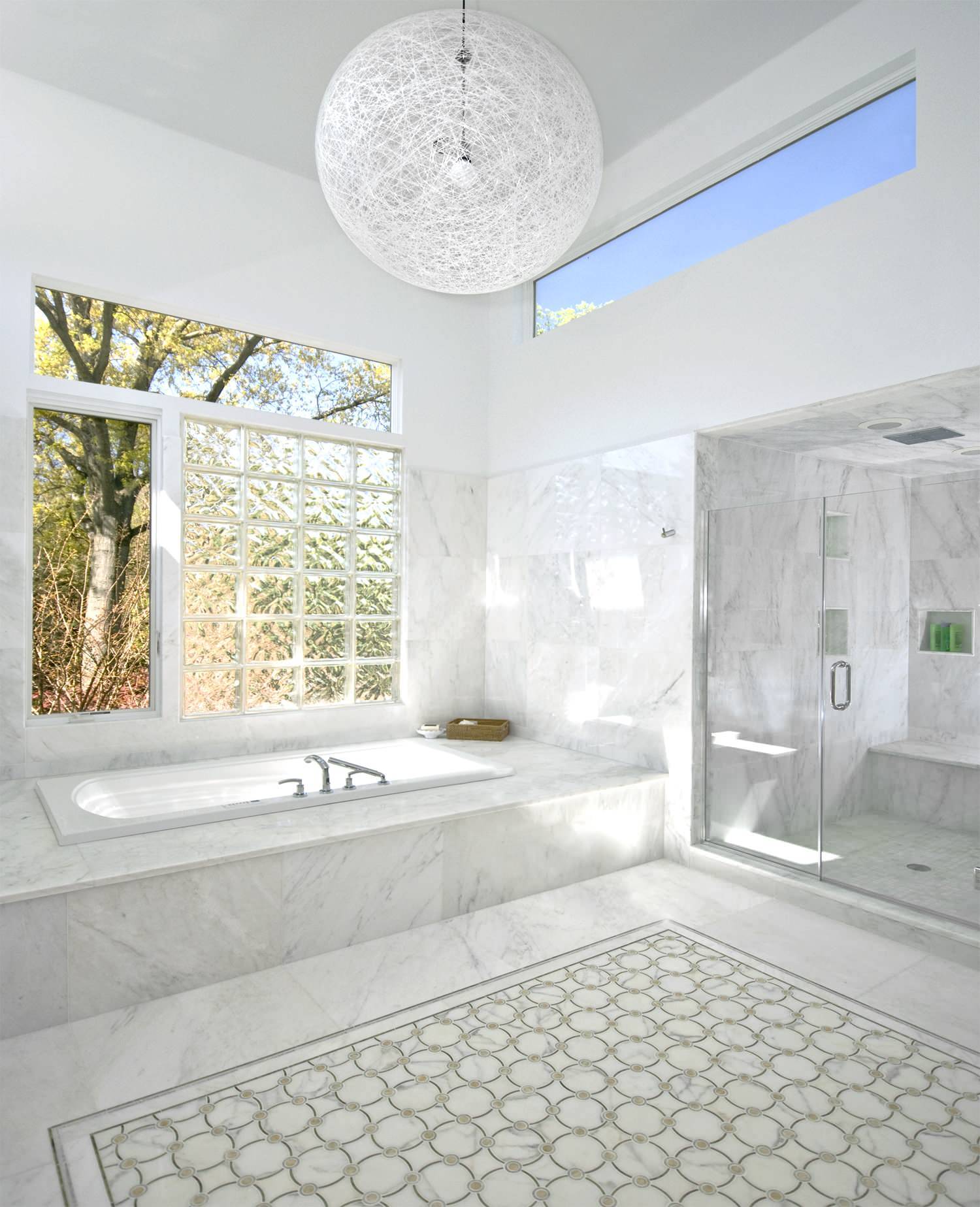 Jendela kaca akan membiarkan cahaya alami menerangi kamar mandi dengan tetap memberikan privasi. Seperti yang terlihat di bawah, jendela besar adalah pilihan elegan yang melengkapi ubin marmer dengan sempurna. Jangan ragu untuk bermain dengan berbagai bentuk dan tekstur untuk menciptakan titik fokus yang unik. Atau, buat partisi shower yang ramping untuk membuat pernyataan mewah.