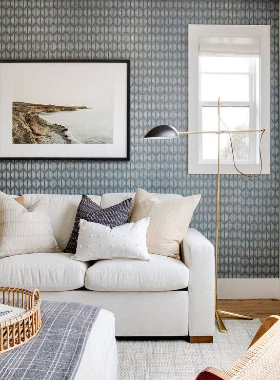 ![Two pink and blue canvas art pieces hang over a blue velvet sofa topped with white and blue pillows and positioned facing side-by-side cream wool ottomans.]()