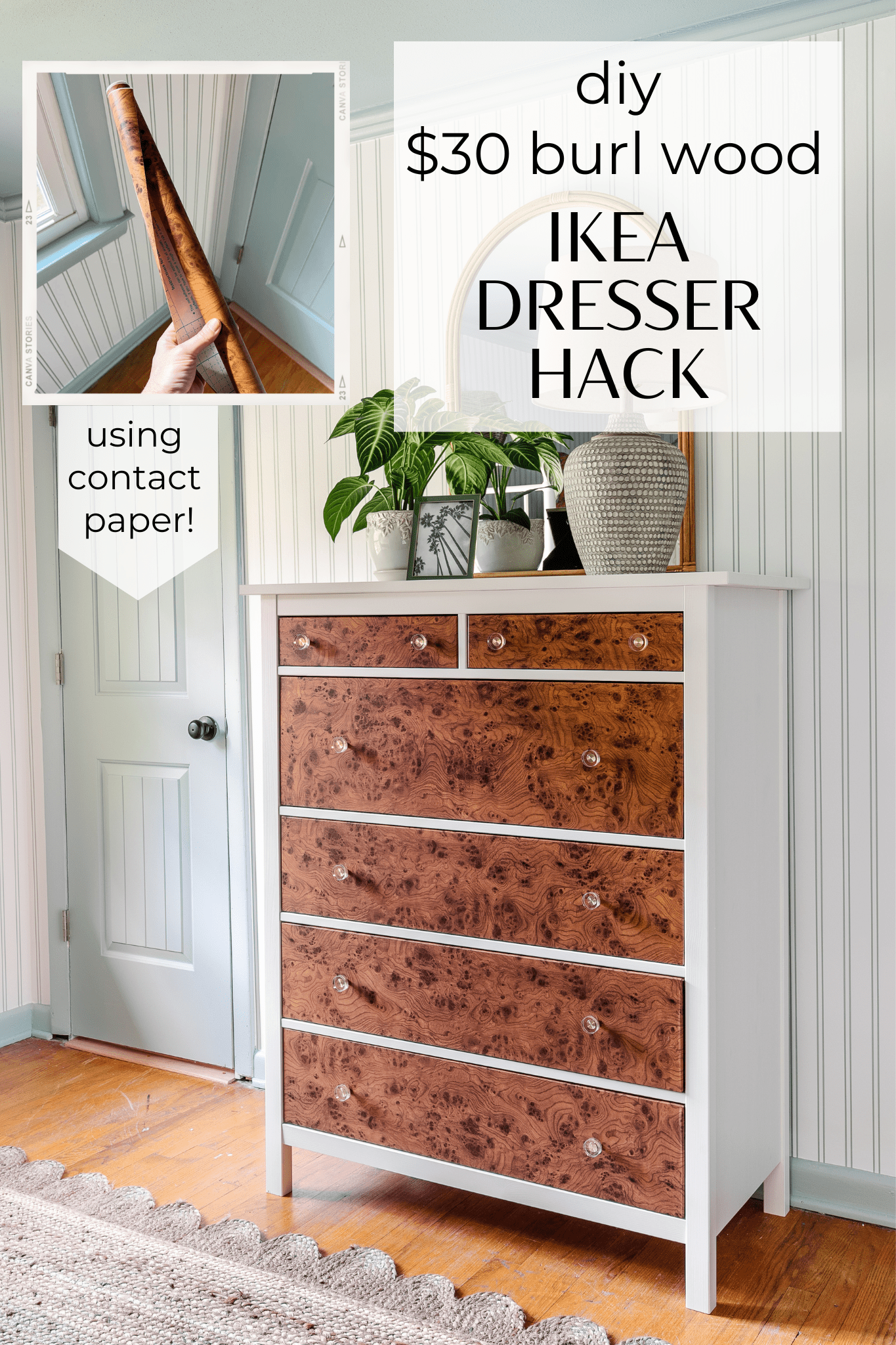 Jika Anda ingin melampaui meja rias, Anda bahkan dapat mencoba retas kertas kontak kayu burl ini di pintu depan datar untuk lemari pakaian IKEA PAX, meja samping IKEA LACK, atau lemari penyimpanan IKEA BESTA.