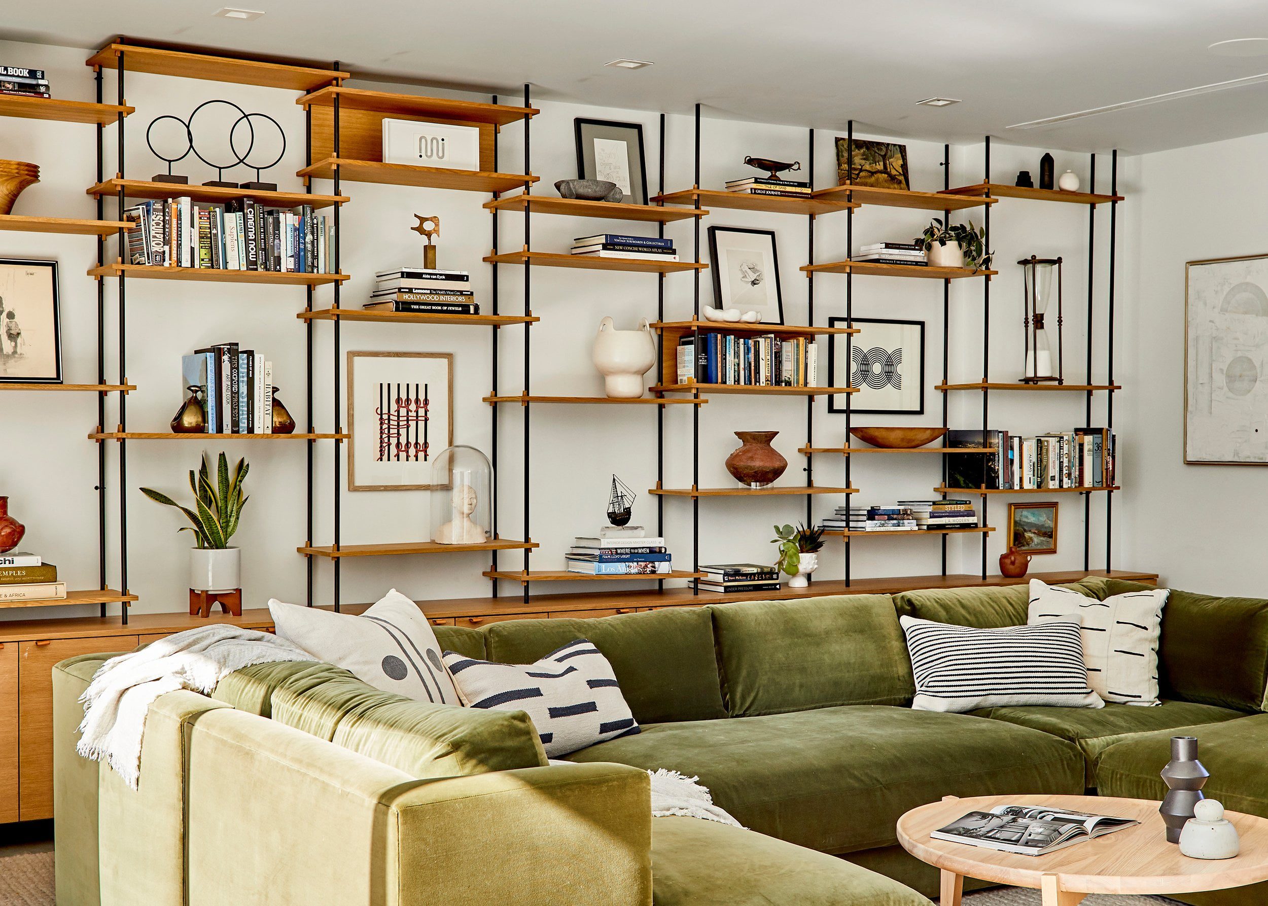 Untuk mencegah rak Anda terasa seperti toko barang bekas dengan benda-benda acak yang diletakkan bersebelahan, coba buat sketsa di dalam rak. Jika Anda fokus membuat satu sketsa kohesif pada satu waktu, seluruh rak tidak akan terasa terlalu banyak. Anda bisa mulai dengan menambahkan buku, menumpuknya secara horizontal dan vertikal, lalu mulai melapisi seni dan objek Anda. Di ruangan di atas yang dirancang oleh Sara Ruffin Costello, sebagian besar rak dibagi menjadi dua sketsa terpisah (satu di setiap sisi) yang menyisakan ruang bernapas di dalam rak. Menjaga beberapa ruang terbuka membuat mata Anda istirahat dan menjaga rak agar tidak terlihat terlalu berat secara visual.