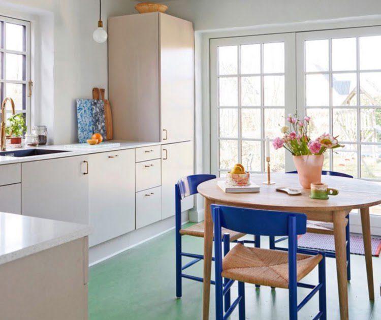 Saya suka bagaimana Ann-Sophie menggunakan percikan biru Klein di seluruh rumahnya – terlihat di atas meja dan di bawah kursi.