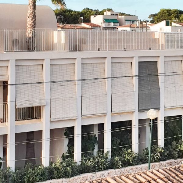 Serangkaian halaman interior dan jalan setapak yang tertutup tirai kayu mendefinisikan sebuah rumah sempit di Mallorca yang dirancang oleh Studio Perusahaan praktik Spanyol.