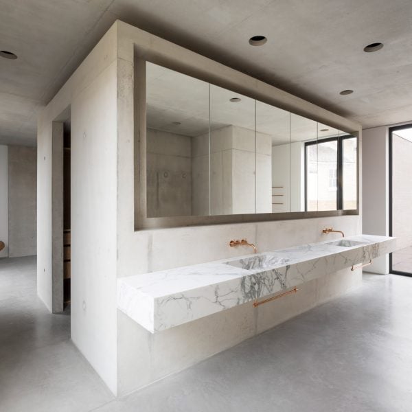 Unit kamar mandi beton yang dilengkapi dengan celah bayangan besar di bawah langit-langit membagi salah satu dari empat kamar tidur rumah. Ini kontras dengan wastafel marmer dekoratif dan keran serta detail berwarna tembaga.