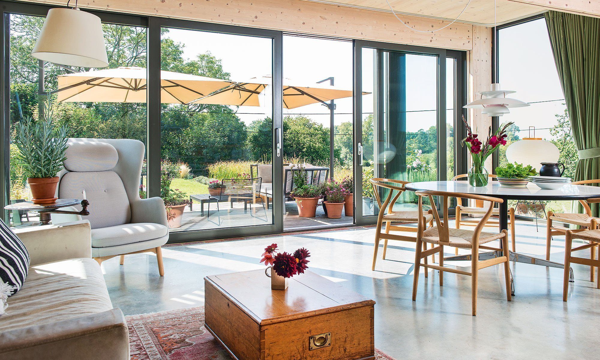 Di sini, dan di seluruh rumah, panel kayu di langit-langit membawa kehangatan yang indah ke ruangan terbuka yang dipenuhi cahaya.