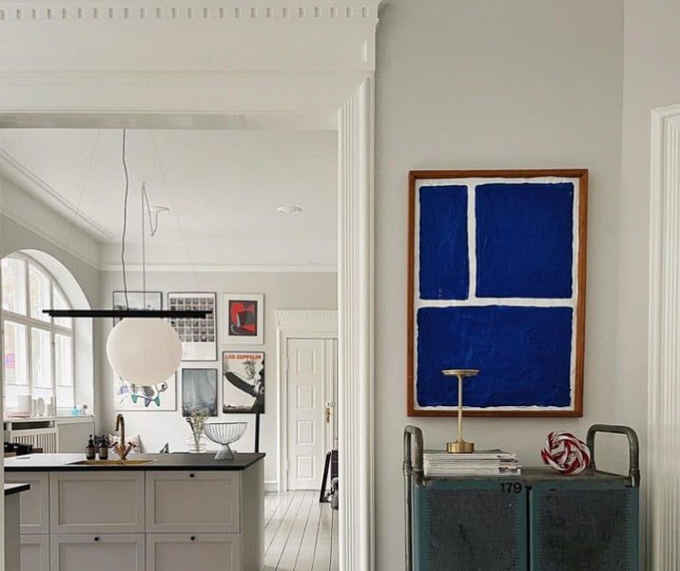 Anne mengecat ulang kabinet bekas yang diambil dari DBA toko barang bekas Denmark. Karpetnya dari Benuta dan dindingnya menampilkan karya seni seperti Vinyl Guy oleh Jenny o Jens.