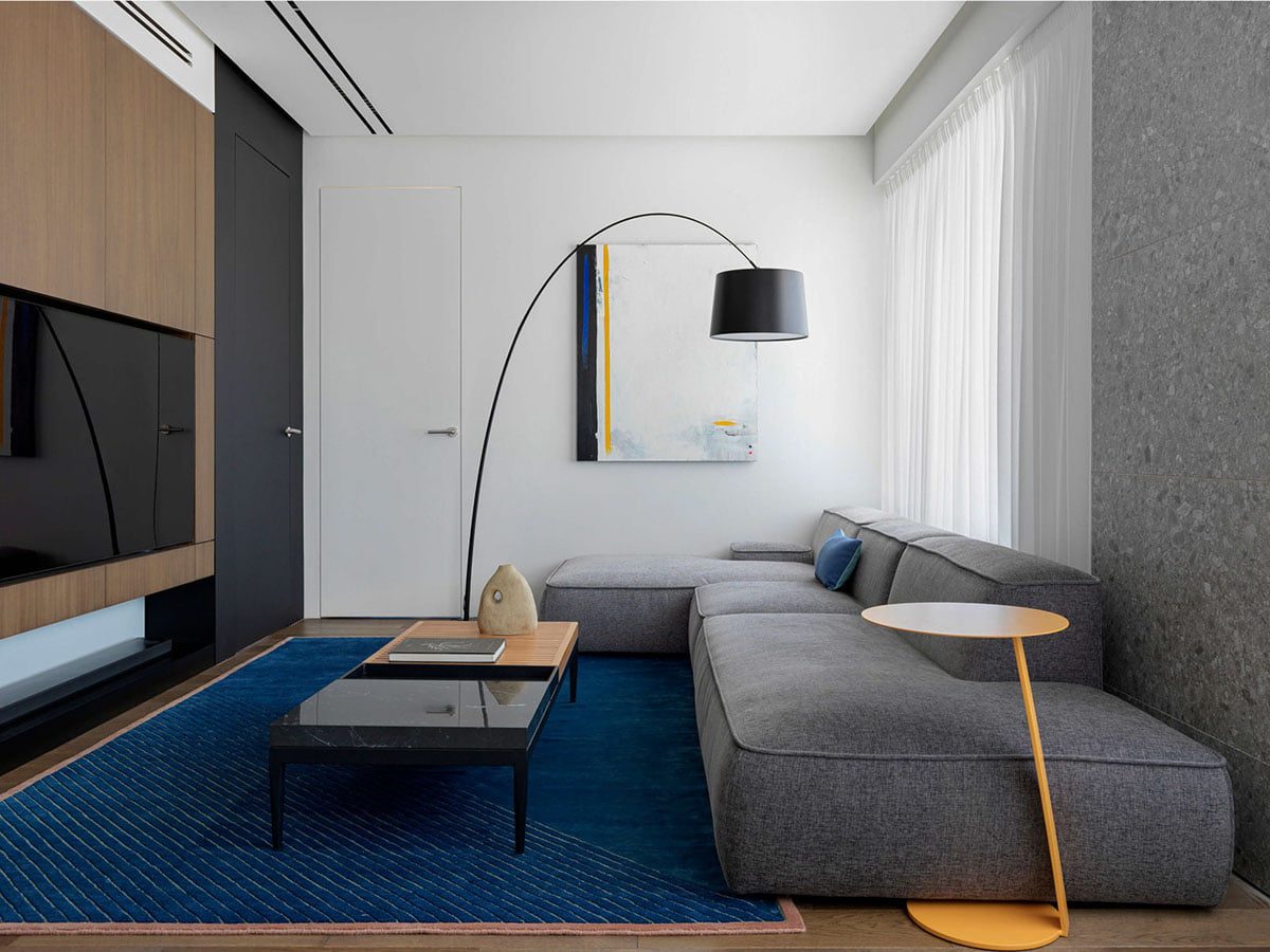 Ruang tamu yang ringkas menjadi hidup dengan permadani bertekstur biru kobalt dan seni dinding modern yang serasi. Dua bantal pencar berwarna biru mengambil aksen ke sofa ruang tamu abu-abu modern. Aksen kuning kontras menambah kontradiksi optimis.