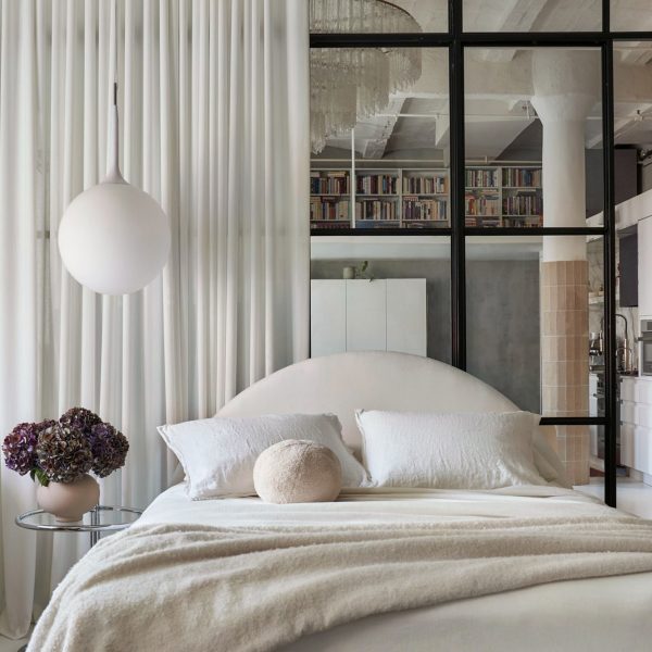 “Ruang itu sendiri yang memimpin,” kata Sinclair, yang mendirikan studio eponimnya bersama suaminya, Ben. “Idenya adalah untuk menarik perhatian ke langit-langit tinggi dengan tirai setinggi langit-langit dan dinding partisi logam/kaca. Karena ruangannya terang, kami memutuskan untuk mengecat semuanya dengan warna putih.”