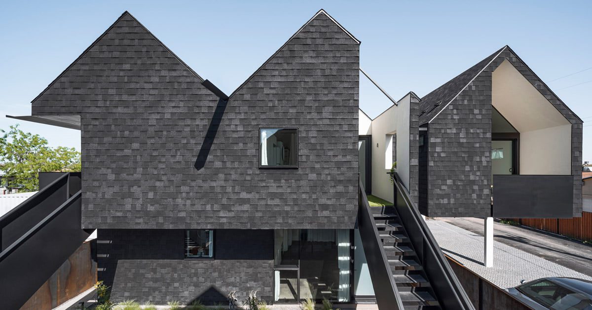 Di ketinggian yang menghadap ke jalan, kantilever tingkat atas di atas tingkat yang lebih rendah, membentuk area terlindung untuk bersantai dan terhubung dengan tetangga.