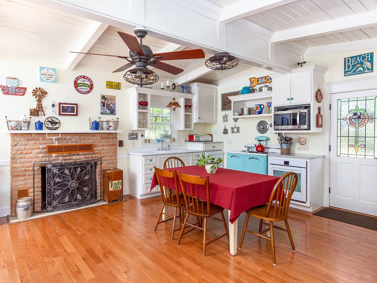Ada beberapa cara untuk membuat dapur bergaya pedesaan yang lebih berwarna tanpa memecah ruang secara visual. Pertama, pilih warna yang ingin Anda perkenalkan di sini. Semuanya disambut di dapur yang tak lekang oleh waktu ini, mulai dari warna merah cerah dan oranye cerah hingga hijau santai dan kuning cerah.