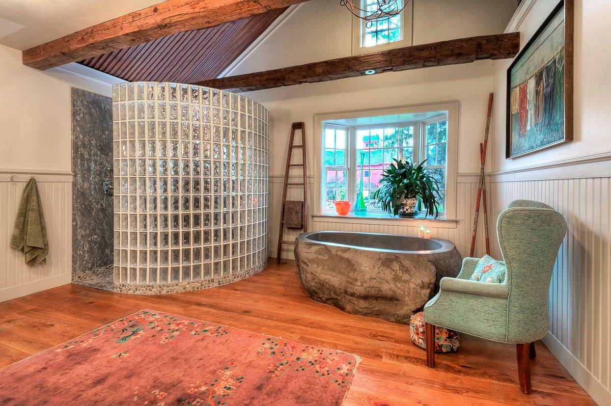 Ya, balok kaca terlihat sama bagusnya di ruangan mana pun di rumah Anda – mulai dari pintu masuk, ruang tamu, hingga dapur dan teras. Dan kami berjanji akan membagikan inspirasi ini kepada Anda nanti. Tapi itu kamar mandi di mana mereka tampaknya paling efektif, karena mereka membiarkan banyak cahaya alami sambil tetap menawarkan privasi lengkap. Cahaya yang menyebar dari blok kaca tidak terlalu terang dan menciptakan pola cahaya dan bayangan yang berbeda sepanjang hari. Berbeda dengan dinding kaca pada umumnya untuk kamar mandi, Anda tidak memerlukan tirai tambahan di sini, yang akan terbayar terutama ketika ruang terbatas.