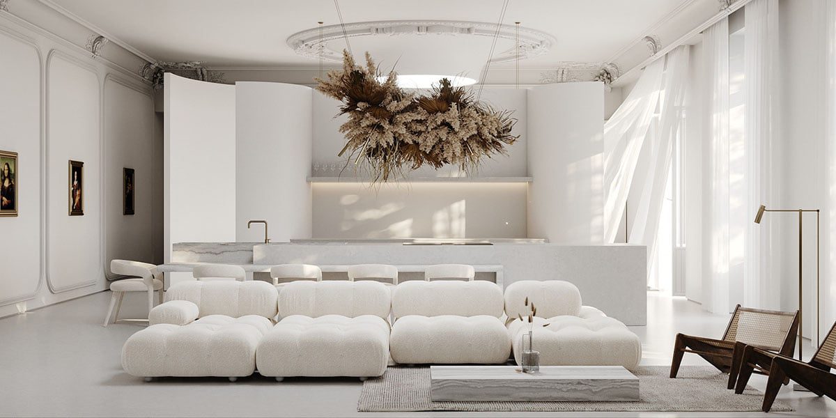 Di dalam desain apartemen neoklasik putih halus ini, sofa modular putih tampak lembut seperti awan.