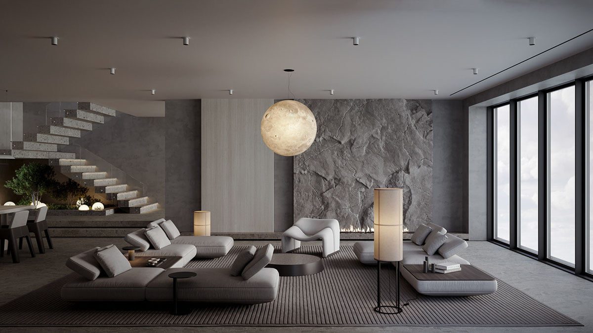 Perpaduan warna abu-abu yang tenang membentuk desain interior modern yang mewah ini. Palet bahan campuran memberi tekstur ruang, kedalaman, dan minat dramatis. Divisualisasikan oleh Ivan Shmailykov, lantai utama rumah adalah denah terbuka lebar. Area lounge yang lapang terletak di samping zona makan dapur yang ramah untuk mencapai satu koneksi yang mengalir bebas. Skema pencahayaan di dalam konsep ini juga direncanakan dengan hati-hati. Lampu lantai, lampu meja, dan lampu gantung dengan jarak yang tepat menambah kehangatan pada skema dekorasi minimalis. Potongan-potongan furnitur kontemporer meletakkan siluet yang ringkas dan halus, dan desain tangga modern yang ramping menjulang seperti karya seni pahat.