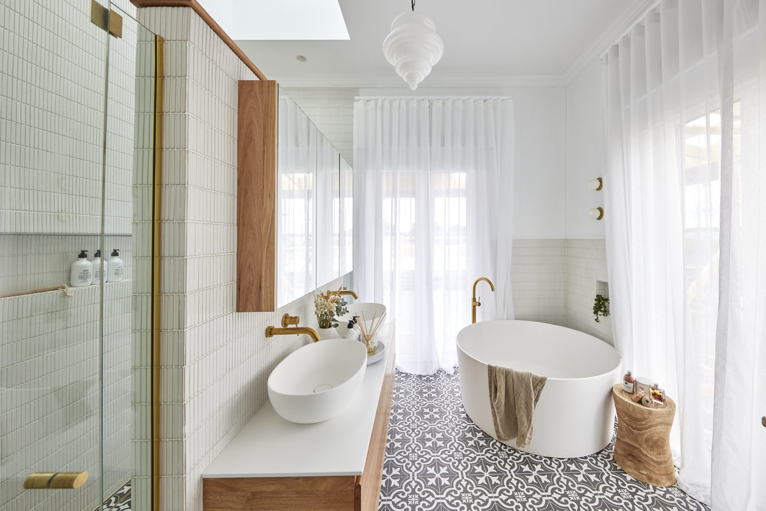 Namun, tidak semuanya sesuai dengan persetujuannya, karena kamar mandi terlalu dekat dengan dinding dan toilet—sulit dipahami dengan begitu banyak ruang, kata Shaynna—dan sambungan dan sambungannya tidak lengkap. Tetapi dengan gaya yang tepat, sampai ke krisan yang sebenarnya, itu adalah Neale, dia merangkum: “Ruang kontemporer dengan sentuhan tradisional yang cukup.”