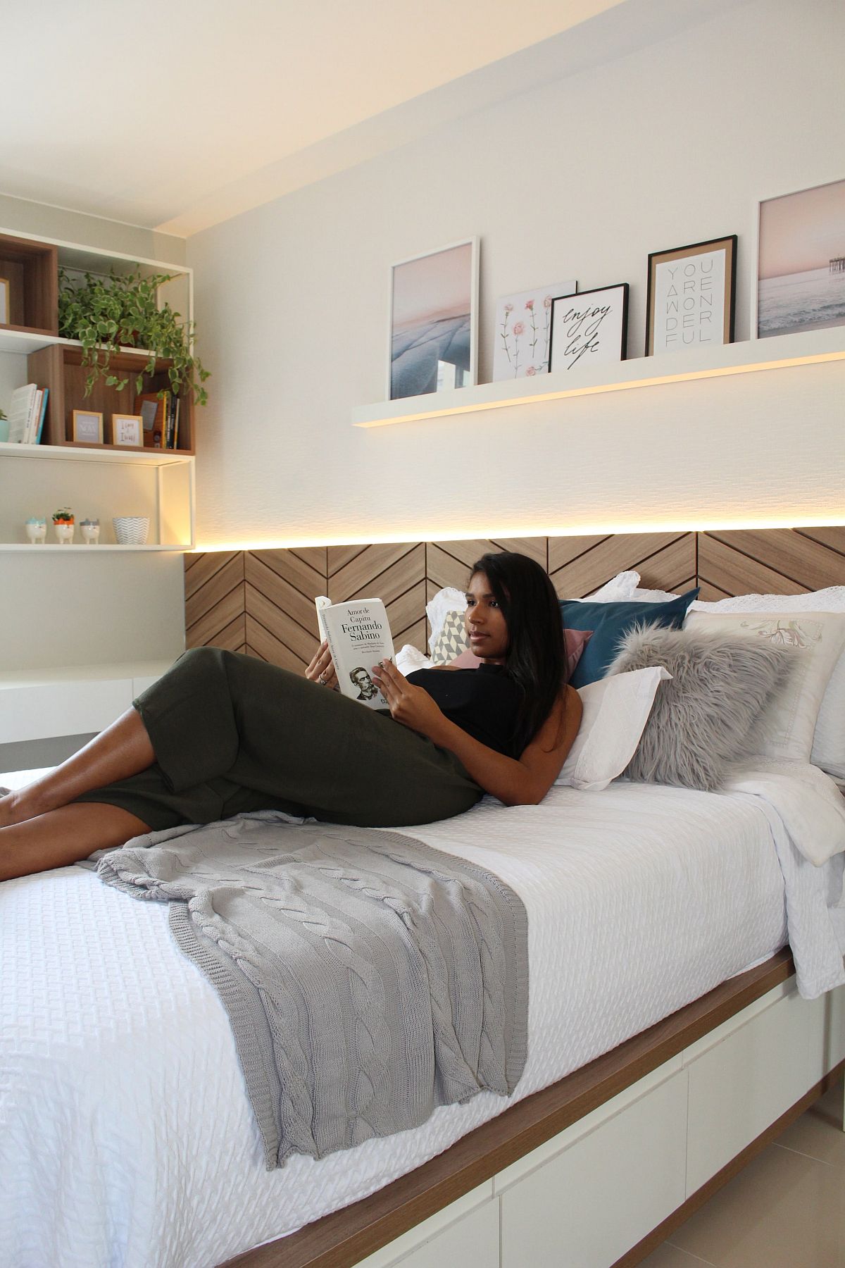 Ada fitur tambahan seperti rak sepatu di bawah tempat tidur yang bisa masuk dengan rapi saat tidak digunakan. Serta, headboard kayu dengan pola chevron dan lampu strip LED yang memberikan cahaya hangat pada latar belakang netral. Kontemporer, cantik, dan berkelas, ini adalah perubahan kamar tidur yang sempurna yang memiliki semuanya!