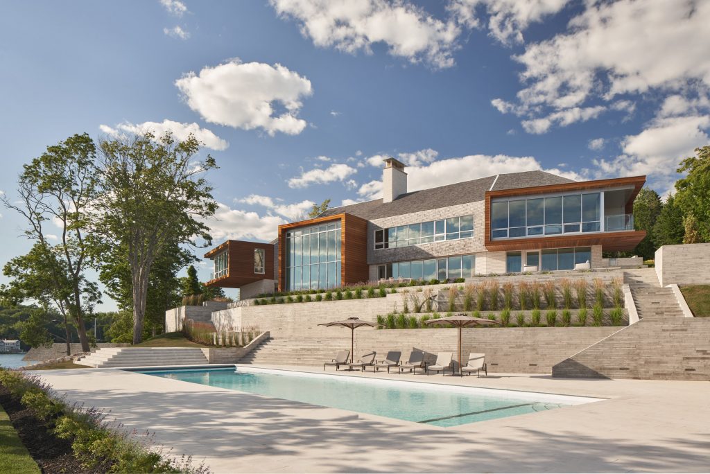 Batu kapur Indiana menutupi dasar rumah sementara dinding beton berbentuk papan memutar melalui lansekap, mengarah ke bak mandi air panas dan kolam renang. Rumah kolam yang berdekatan memiliki selubung rendah yang ramping dan dinding jendela yang dapat dioperasikan menghadap air.