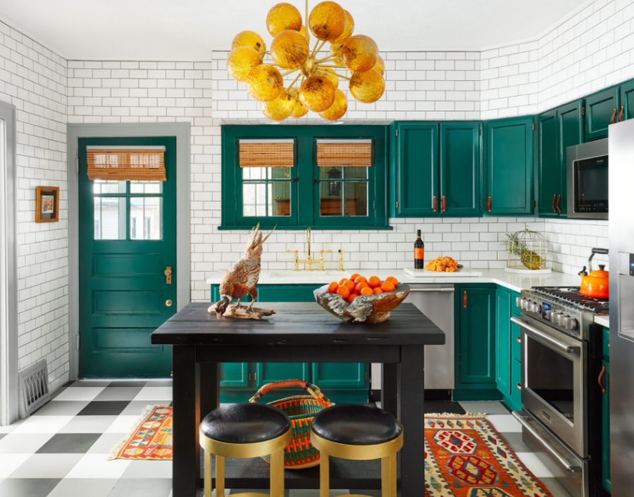Ide keren lainnya adalah mengambil inspirasi dari warna pelengkap tetapi pada akhirnya membuat palet unik Anda sendiri. Misalnya, biru dan oranye dan merah dan hijau saling melengkapi, tetapi dapur ini memiliki rentang warna yang cukup unik dan tidak biasa berdasarkan pasangan ini. Ubin kereta bawah tanah putih dan abu-abu netral dan hitam membuat skema warna yang indah ini terlihat lebih menakjubkan.