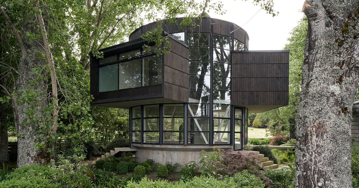 Lantai pertama terbuka – menampilkan ruang tamu dan ruang makan dengan dapur persiapan kecil dan pemandangan 360 derajat – berbentuk bulat. Di atas, tiga kamar tidur en-suite “kotak” disusun dalam segitiga, kantilever keluar dari lingkaran dan dilapisi pinus yang telah dikeringkan pada suhu 300 derajat Celcius untuk meningkatkan sifat termal dan umur panjangnya.