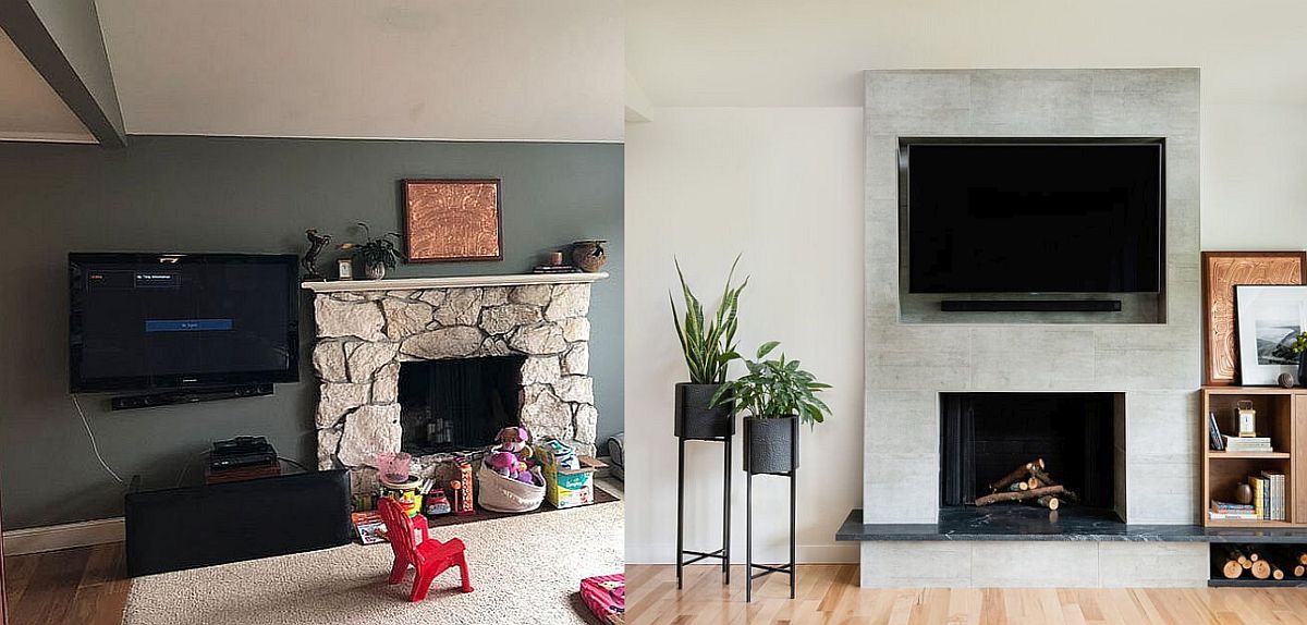 Salah satu hal pertama yang Anda perhatikan setelah perombakan adalah bagaimana perapian lama telah diganti dengan versi modern yang lebih ramping. Hal ini terlepas dari kenyataan bahwa TV layar datar besar diletakkan di atasnya. Di samping itu, ruang kecil yang lama dan terlupakan sekarang memiliki lemari kayu yang dibuat khusus dan gagah yang membantu mengatur Desain Ruang Tamu Yang Elegan jauh lebih baik. Terdapat ruang untuk kayu bakar di bawah unit ini, sementara area kulit yang nyaman dan meja kopi yang sejuk melengkapi ruang tamu.