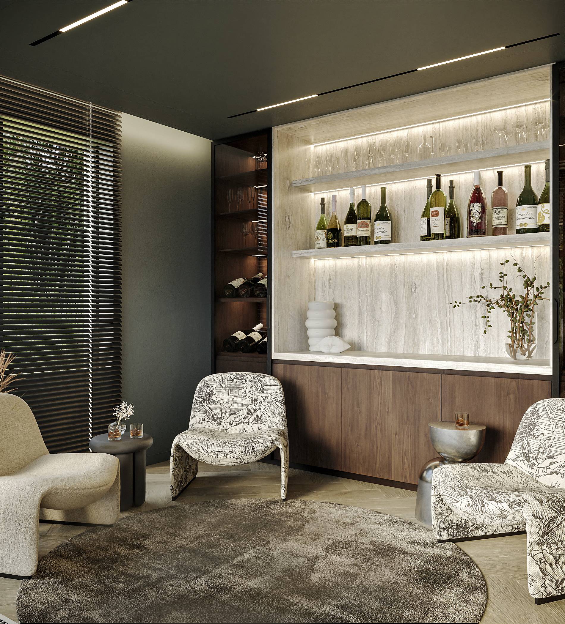 Pemilik rumah ini adalah pecinta seni yang memiliki hasrat untuk menjamu tamu, sehingga mereka menginginkan ruang yang benar-benar unik yang dapat memenuhi semua kebutuhan mereka. Untuk memastikan keinginan dan kebutuhan mereka terpenuhi, Alina Sulina Designs sangat memperhatikan tata letak rumah. Misalnya, mereka telah membuat area bar khusus dengan ruang untuk membuat minuman di mana tuan rumah dapat menghabiskan waktu dalam kelompok yang lebih kecil dan menikmati waktu mereka bersama tamu istimewa.