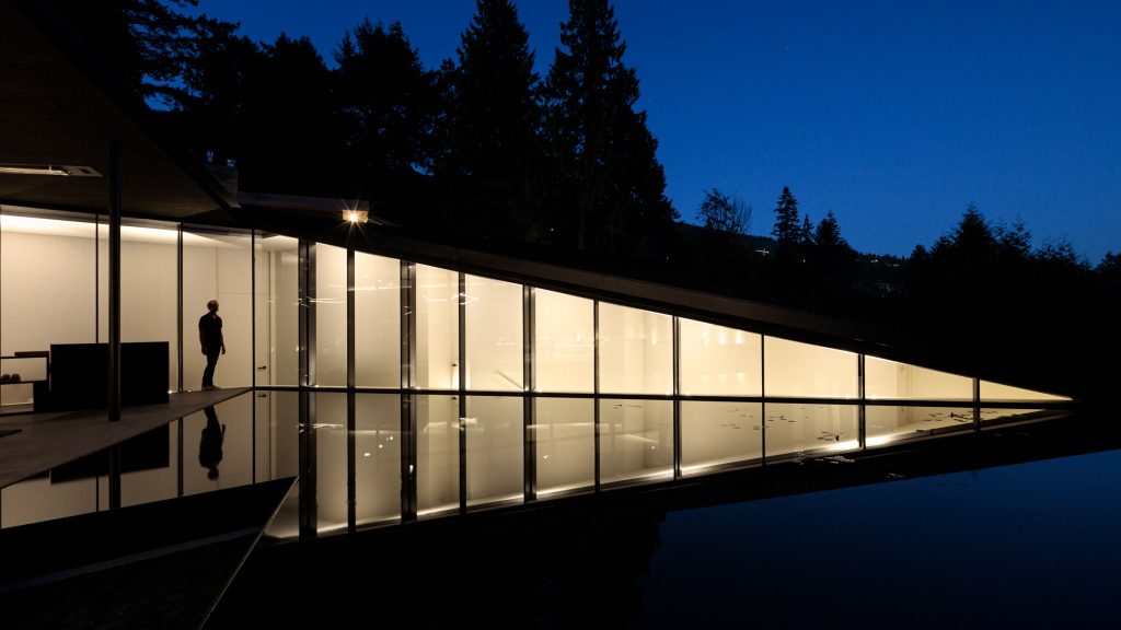 Edmonds International – perusahaan global yang berkantor pusat di Vancouver dan Mexico City – merancang hunian berbentuk V seluas 800 meter persegi yang menyeimbangkan transparansi, refleksi, dan pemandangan.