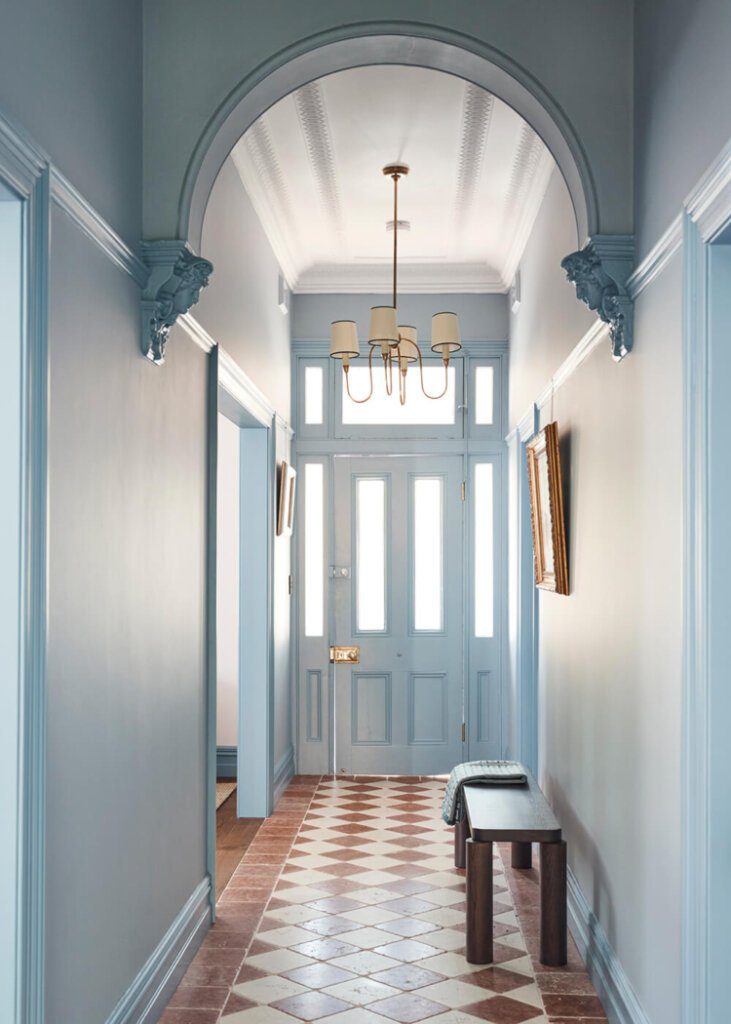 Rumah tradisional penuh warna dan pola dengan penekanan pada warna biru surgawi. Mosman Residence oleh desainer interior yang berbasis di Sydney, Tom Mark Henry.