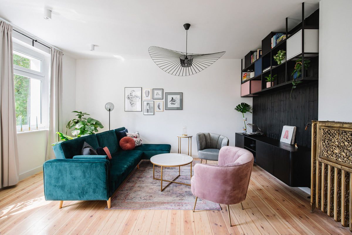 Kelimpahan aksen warna-warni membangun desain rumah yang cerah dan ramah ini. Elemen biru cerah, pink manis, hijau zamrud, hitam matt, dan emas berkilau bertemu untuk menciptakan kontras yang berani dan karakter yang menyenangkan. Gaya furnitur yang berbeda dari berbagai era membentuk tata letak eklektik yang menarik. Dirancang oleh bo/sko, ruang beragam ini menawarkan segudang ide dekorasi untuk semua jenis rumah. Di ruang tamu, kami bertemu dengan dinding media modern berwarna putus-putus dan radiator emas antik yang sangat indah. Dapur kecil adalah desain merah muda yang kuat dengan gapura emas yang luar biasa. Di kamar tidur, kami menemukan cita rasa tropis yang ringan dengan batas tekstur taktil.