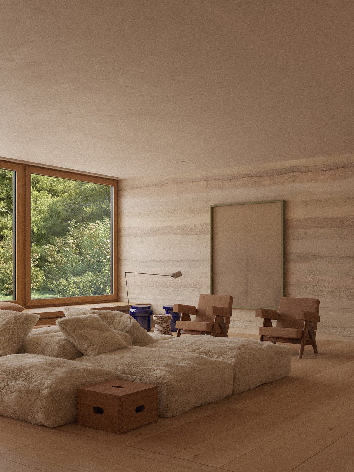 Di dalam rumah, dinding tanah yang ditabrak membangun pola yang halus dan berlapis. Warna alami mereka menciptakan suasana yang nyaman dan keheningan yang damai. Sofa bulu imitasi menempatkan pulau lembut yang tak tertahankan di tengah ruang tamu. Lampu lantai ruang tamu diselipkan di antara modul sofa untuk menawarkan lampu baca yang terfokus. Kursi santai modern menambahkan nada yang lebih dalam dan kontras pada penataan furnitur.